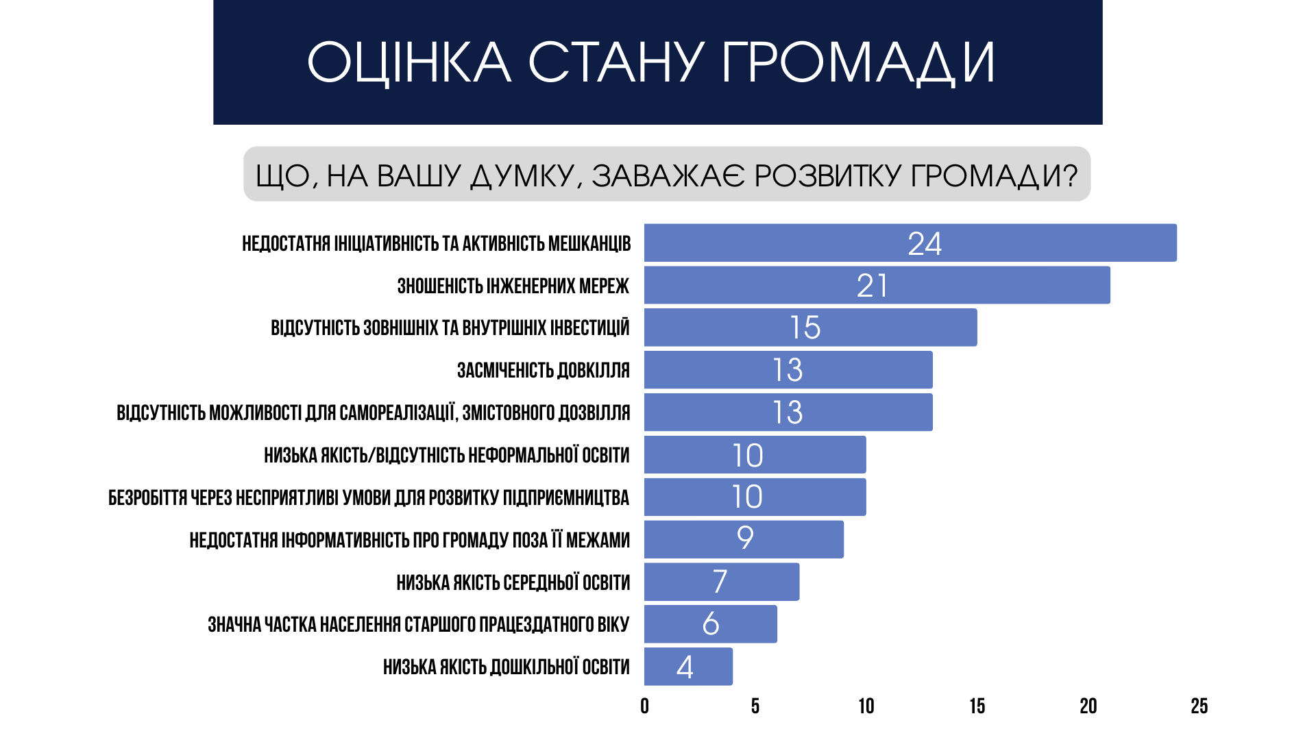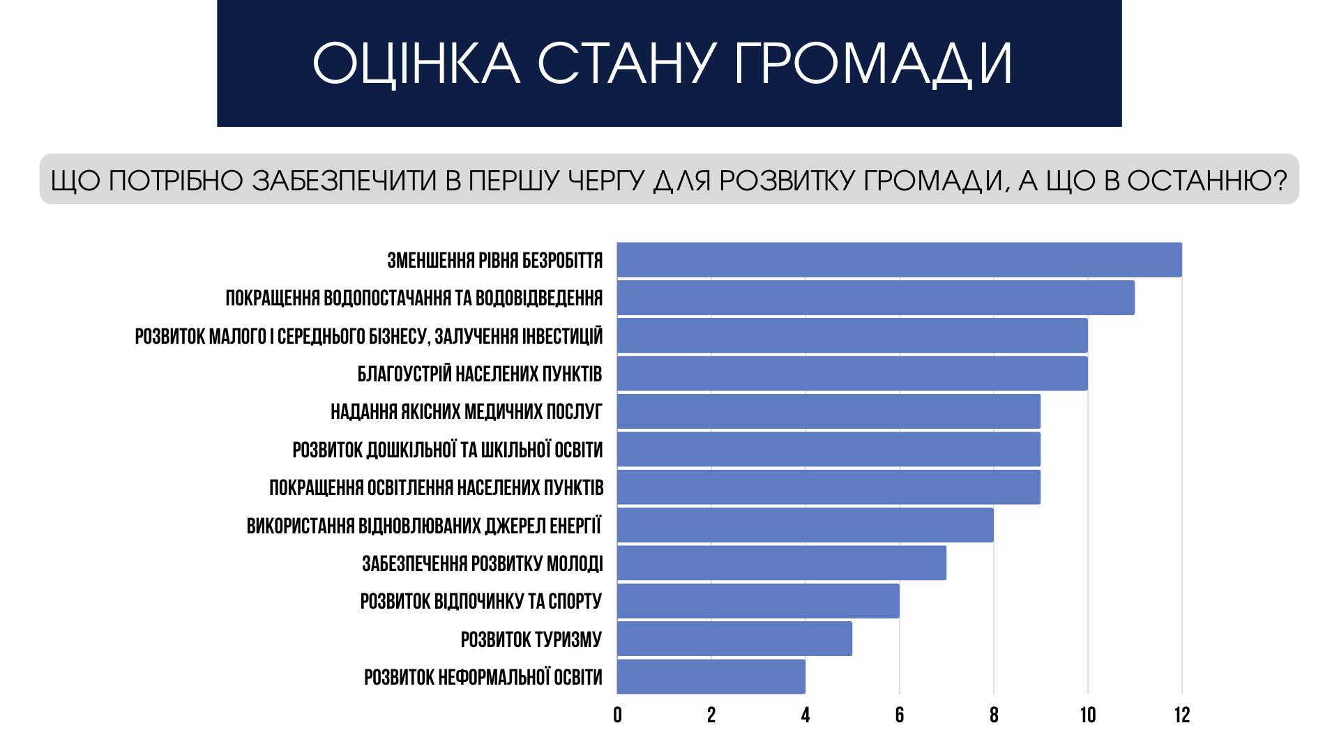 Важливою метою квартальної зустрічі, безумовно, було планування подальшої роботи. Аби визначити основні напрямки діяльності, Офіс розвитку ініціював опитування мешканців щодо актуальних потреб Боратинської громади. Результати опитування презентували на квартальній зустрічі. Це дало змогу учасникам проаналізувати їх та зрозуміти, які сфери розвитку громади є пріоритетними для респондентів, як вони оцінюють стан громади тощо. Зібрані дані буде враховано у подальшій роботі Офісу.