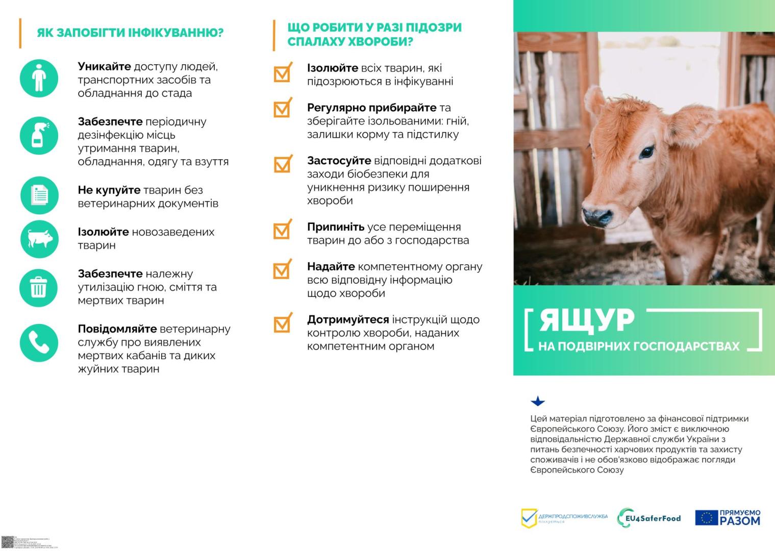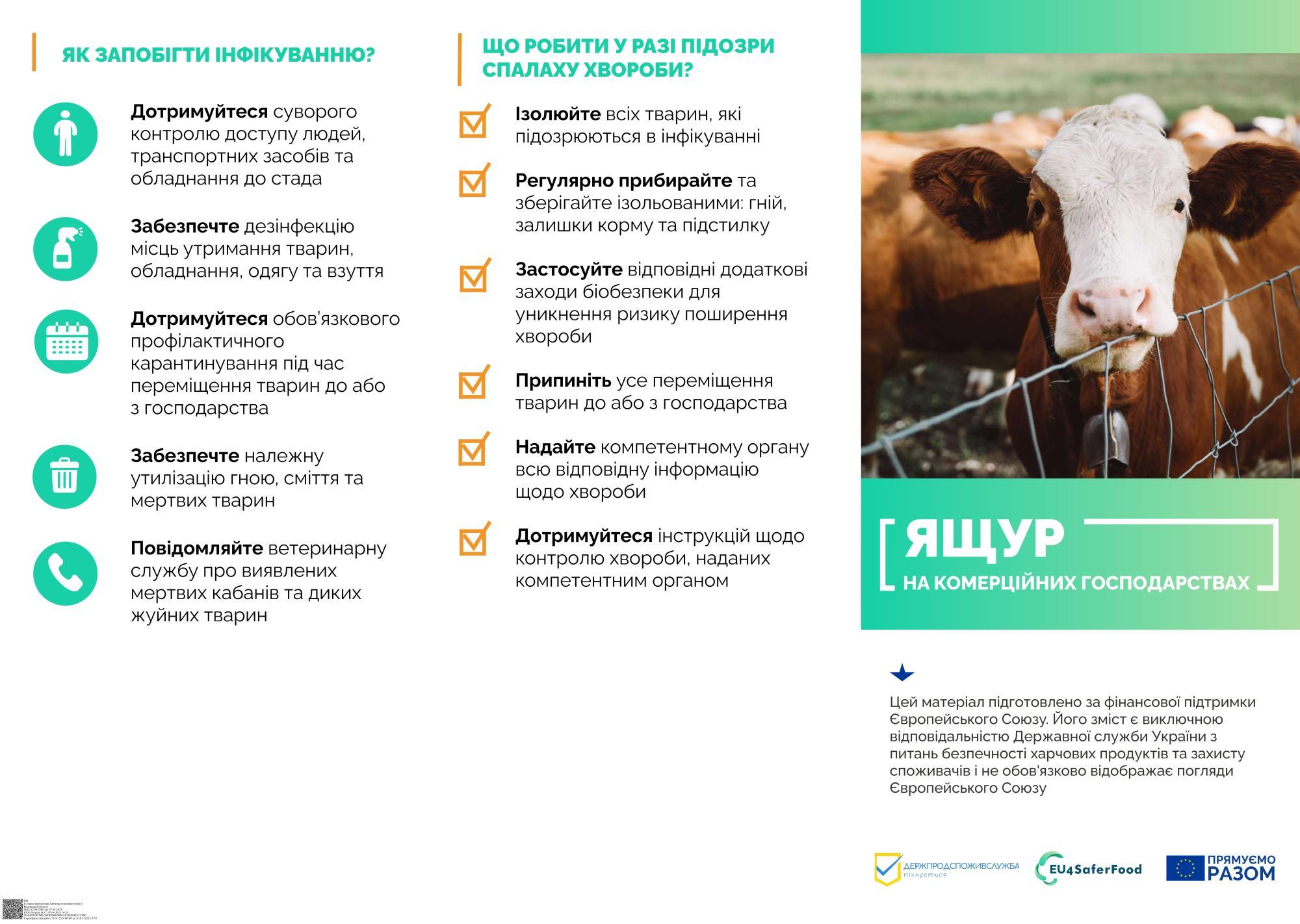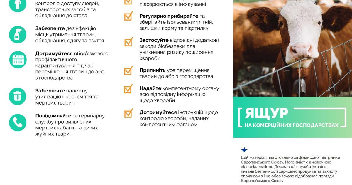 - дотримуватись суворого контролю доступу людей, до стада (заборона стороннім особам потрапляти на територію ферм та в’їзд машин, які перебували за межами господарства, без дезінфекції);