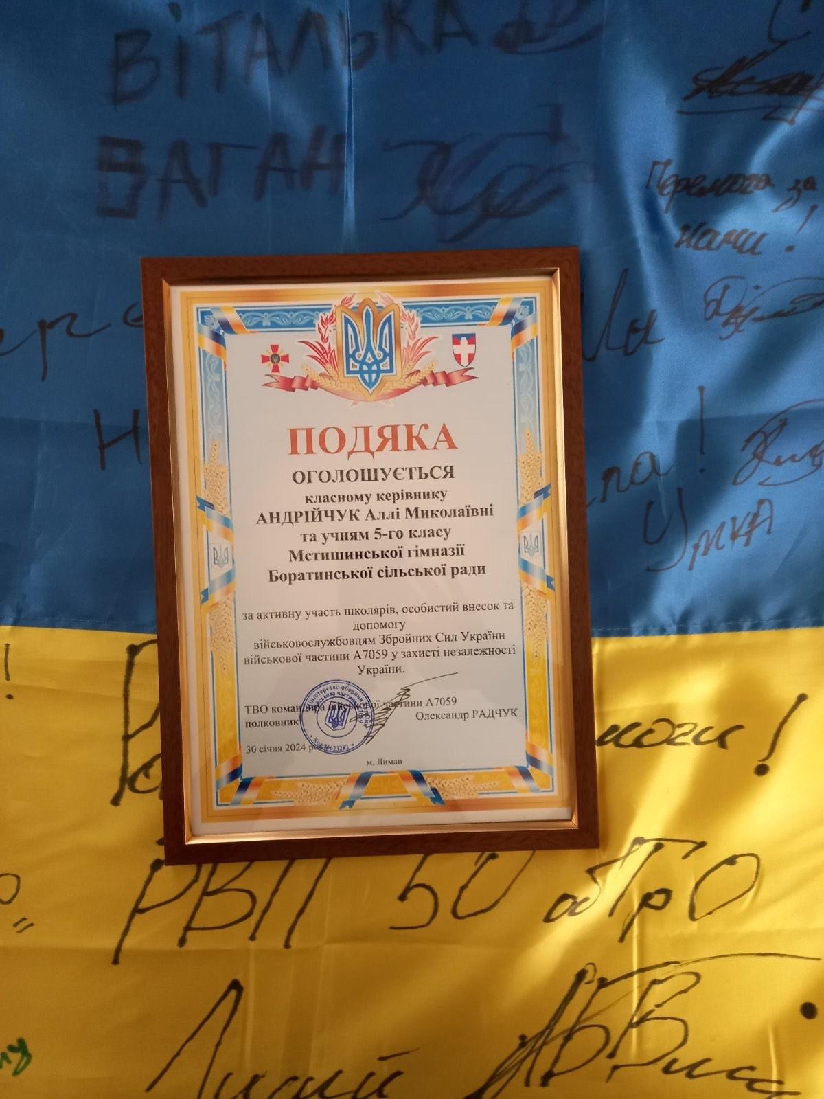 Днями до учнів Мстишинської гімназії завітав о. Роман, настоятель Петропавлівського храму с. Коршовець та Вербаїв із словами вдячності від військовослужбовців Збройних Сил України, які несуть службу у Лимані. Подяку та прапор військової частини із підписами і побажаннями від воїнів він вручив учням 5 класу та класному керівнику Андрійчук Аллі Миколаївні.