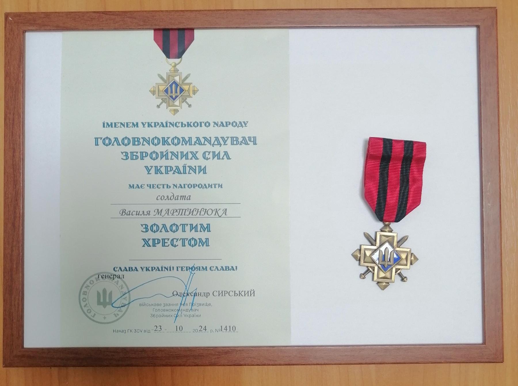За відвагу та честь, незламний бойовий дух та проявленні здібності у бойових завданнях Василя Мартинюка нагороджено нагрудним знаком Головнокомандувача ЗСУ «Золотий хрест».