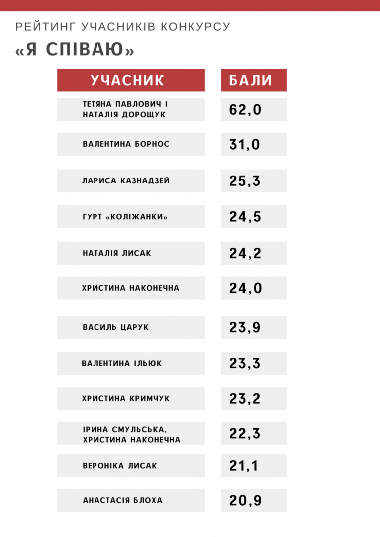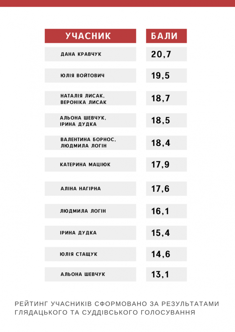 3. Власне трактування і художній смак».Отож, за результатами голосування учасники отримали такі бали від суддів і глядачів: