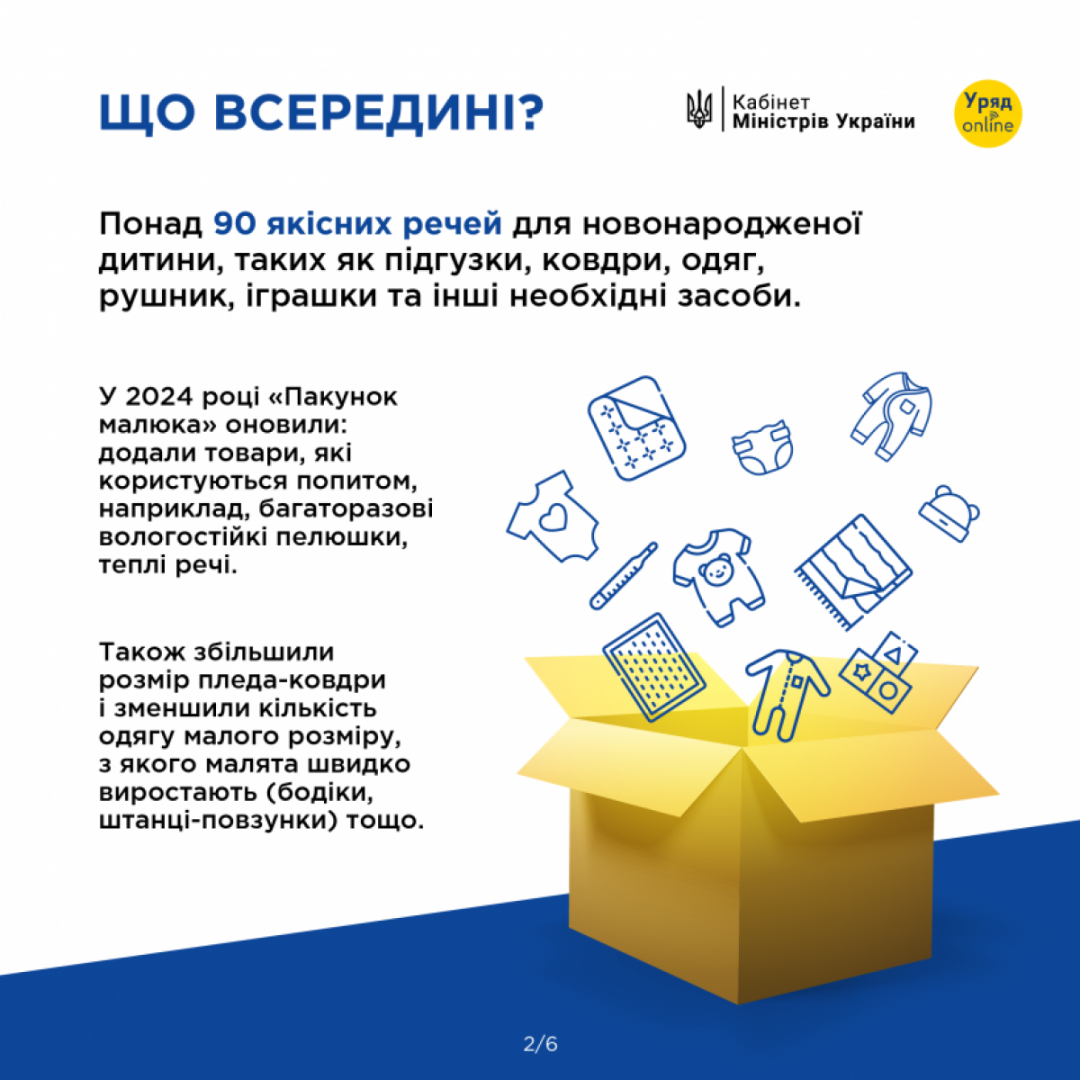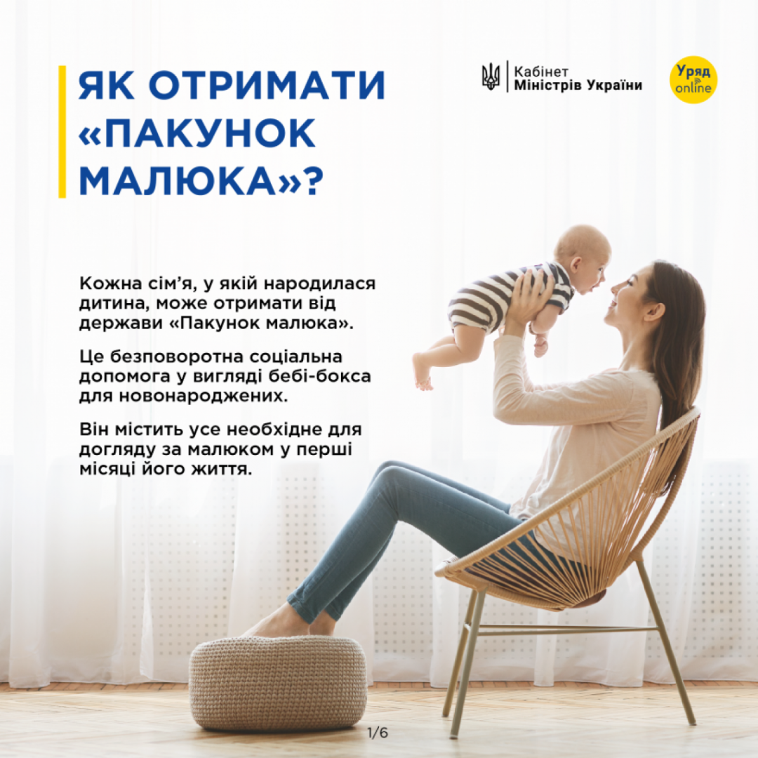 Отримати безоплатну допомогу від держави для новонароджених можуть усі українці. «Пакунок малюка» містить усе необхідне для догляду за дитиною у перші місяці її життя.