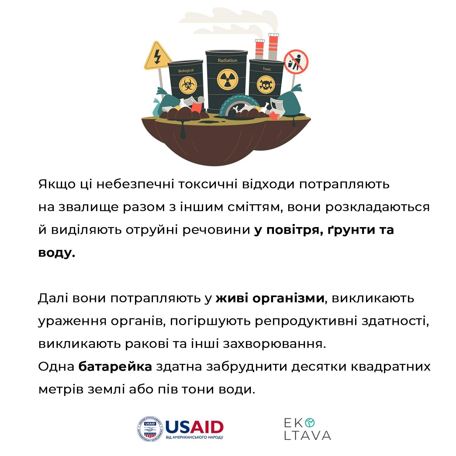 Закликаємо вас бути обережними, здавати небезпечні відходи лише до спеціалізованих пунктів прийому чи Екобуса, що курсує вашою громадою. Не викидайте небезпечні відходи у контейнери для змішаного побутового сміття.