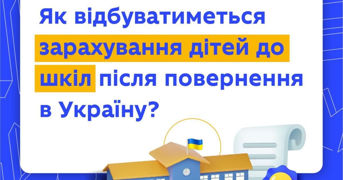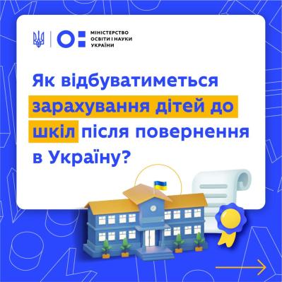 Багато школярів вимушено покинули свої домівки в Україні та навчаються в інших країнах або дистанційно. Міністерство освіти і науки України підготувало перелік необхідних рекомендацій для батьків, освітян та ВПО, щоб спростити процес підготовки до зарахування дітей у школу після повернення в Україну. Рекомендації розроблені згідно з Наказом Міністерства освіти і науки України № 563 «Про затвердження методичних рекомендації щодо окремих питань здобуття освіти в закладах загальної середньої освіти в умовах воєнного стану в Україні».