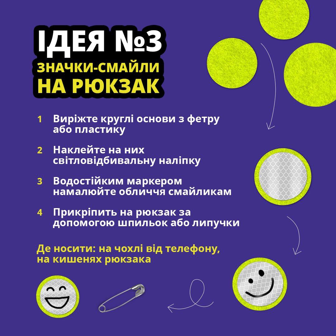 Значки-смайли — яскраві елементи, що легко кріпляться на одяг чи сумку та роблять образ помітнішим у темний час доби.