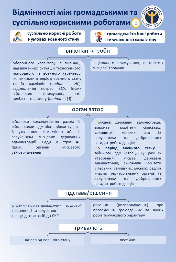 Суспільно корисні роботи використовуються для ліквідації надзвичайних ситуацій, що виникли в період дії воєнного стану та мають оборонний характер. Яка ж різниця між суспільно корисними та громадськими роботами? На це питання відповідає Державна служба з питань праці на своєму сайті.
