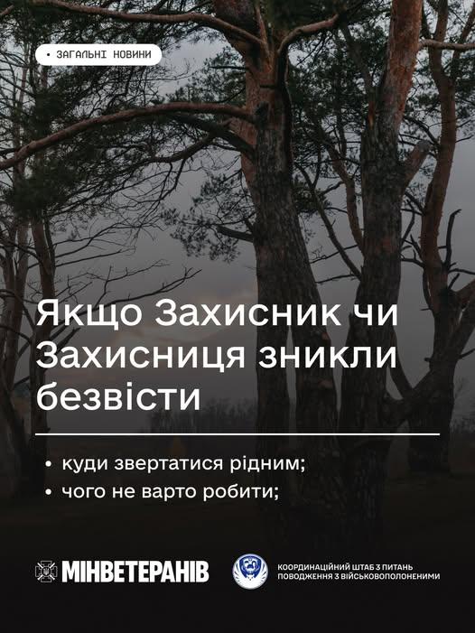 Якщо є припущення про потрапляння у полон – зверніться до Об’єднаного центру з координації пошуку та звільнення незаконно позбавлених волі осіб внаслідок агресії проти України (СБУ):