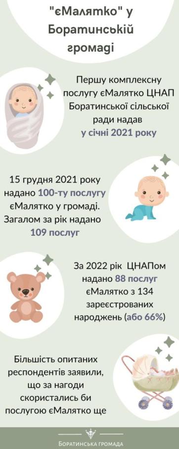 ЦНАП Боратинської сільської ради надає комплексну послугу «єМалятко» з січня 2021 року. Менше, ніж за рік, її отримали 100 сімей громади. «єМалятко» набуває все більшої популярності серед мешканців громади: у 2022 році зі 134 новонароджених громади 88 немовлят було зареєстровано за допомогою послуги «єМалятко», що становить 66% від загальної кількості реєстрацій.