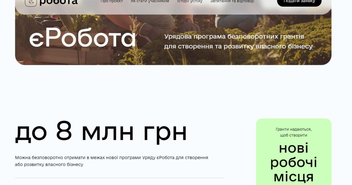 Урядовий проект єРобота передбачає надання українцям грантів для започаткування бізнесу, розвитку підприємництва та навчання. На створення або розвиток своєї справи можна отримати до 8 млн грн.
