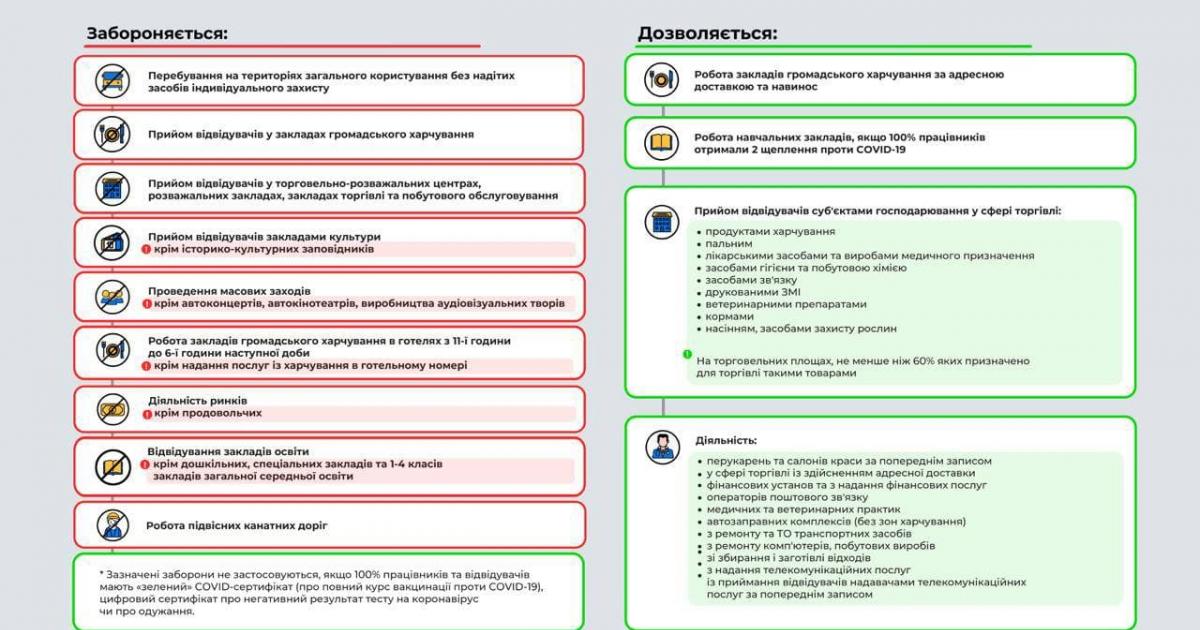 ВАЖЛИВО: зазначені заборони не застосовуються, якщо 100 % працівників та відвідувачів мають «зелений» COVID-сертифікат (про повний курс вакцинації проти COVID-19), цифровий сертифікат про негативний результат тесту на коронавірус чи про одужання.