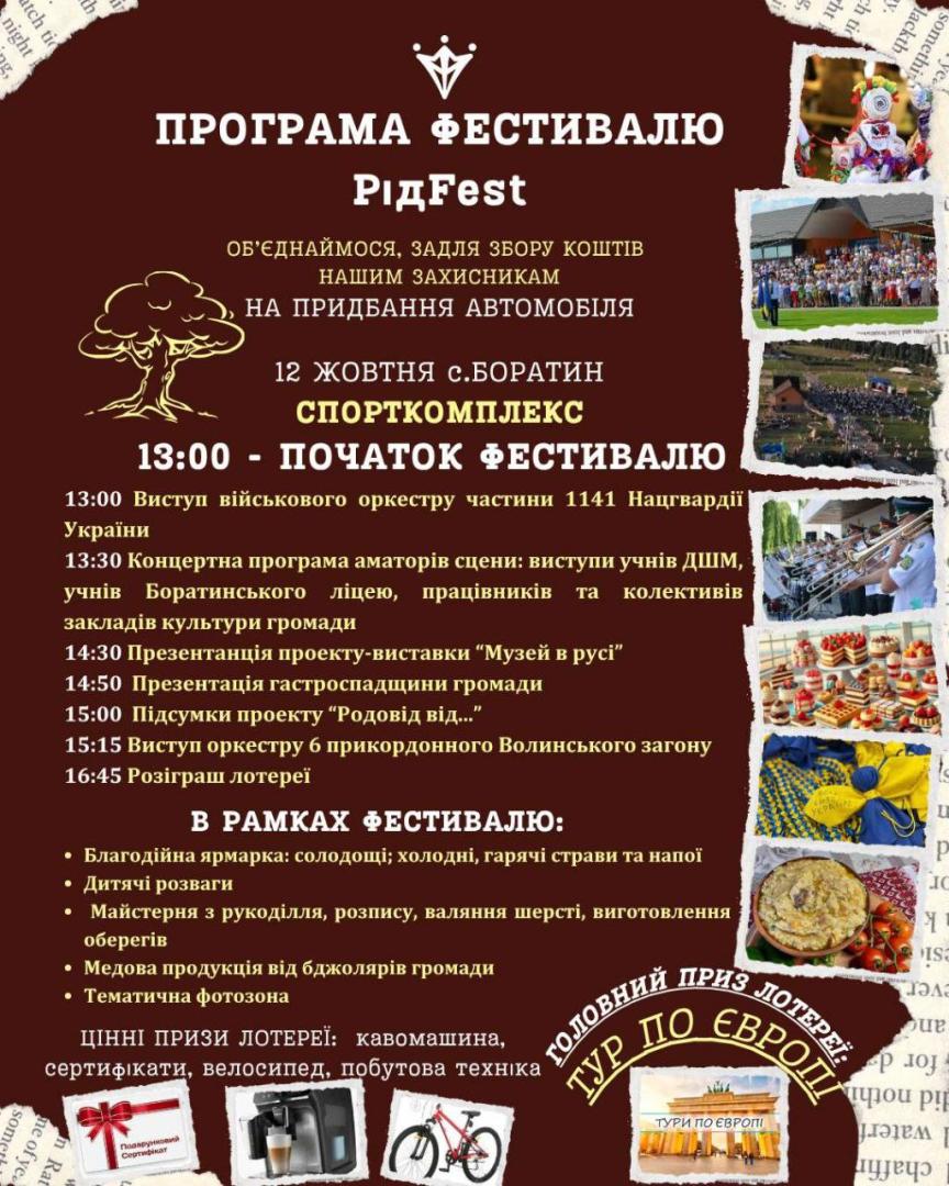 12 жовтня о 13:00 на території спорткомплексу села Боратин відбудеться благодійний фестиваль «РідFest». Подія, яка об’єднає громаду задля доброї мети — збору коштів на придбання автомобіля для наших захисників.