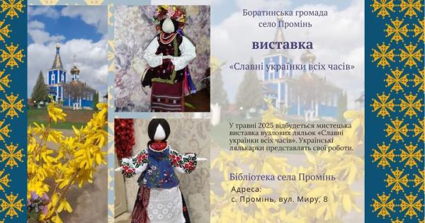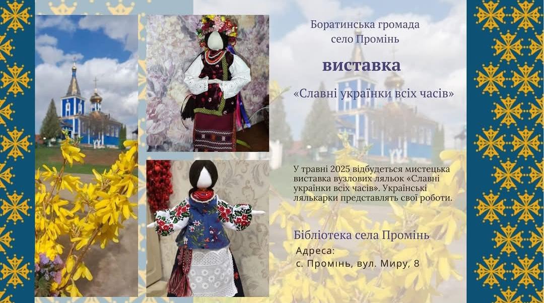 У четвер, 8 травня, о 12:00 в бібліотеці села Промінь відбудеться відкриття виставки вузлової ляльки «Славні українки всіх часів», яка об’єднує дві унікальні колекції ляльок – «Косачівни: історія в узорах і ляльках» та «Від князівен до захисниць».
