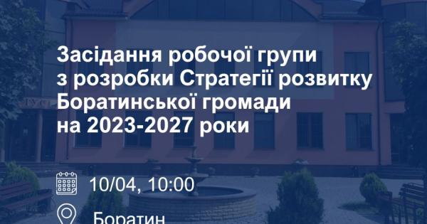 Засідання робочої групи з розробки Стратегії розвитку Боратинської громади на 2023-2027 роки відбудеться 10 квітня о 10:00 у приміщенні Боратинської сільської ради, 3 поверх (с. Боратин, вул. Центральна, 15).