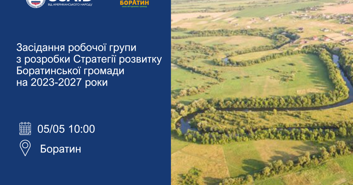 Засідання робочої групи з розробки Стратегії розвитку Боратинської громади на 2023-2027 роки відбудеться 5 травня о 10:00 у приміщенні Боратинської сільської ради, 3 поверх (с. Боратин, вул. Центральна, 15).