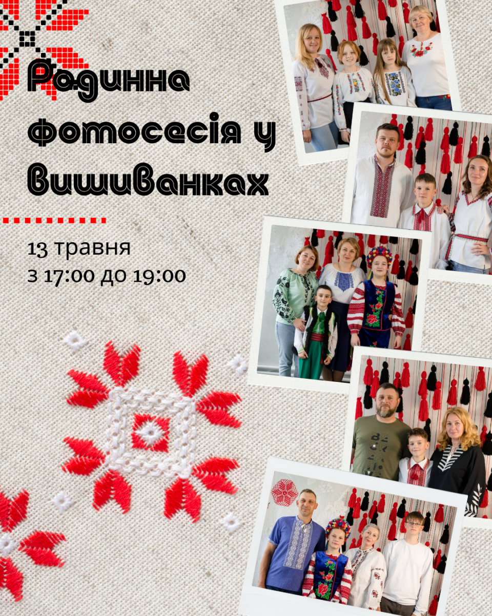 До Дня сім’ї та Вишиванки, 13 травня, з 17:00 до 19:00, відбуватиметься святкова фотосесія для родин у вишиванках.