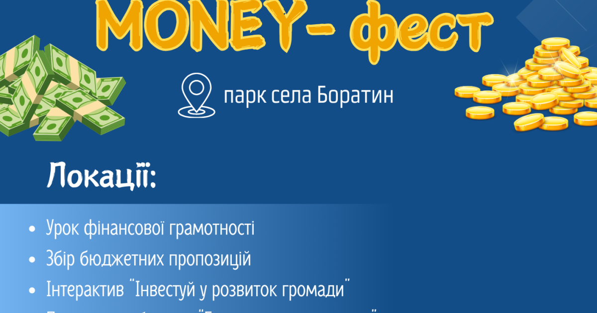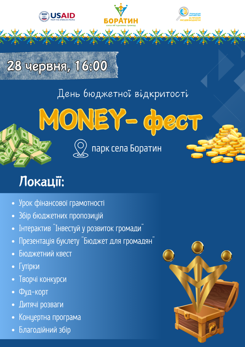 28 червня у Боратинській громаді відбудеться унікальне дійство – День бюджетної відкритості під назвою «Money-фест»! У жителів буде чудова нагода дізнатися більше про бюджет громади, розширити свої фінансові горизонти через різні активності, присвячені темі бюджетування, та навіть внести свої пропозиції до бюджету на наступний рік. В рамках цього заходу до уваги мешканців громади буде презентовано візуалізований буклет «Бюджет для громадян», який дозволить охочим заглибитися у тонкощі бюджетування та у цікавій наочній формі представить бюджет Боратинської громади. На гостей «Money-фесту» чекають тематичні ігри, гутірки, дитячі розваги та фуд-корт. Крім того, в межах заходу триватиме благодійний збір коштів на потреби ЗСУ. Захід почнеться о 16:00 у парку села Боратин (териорія спорткомплексу).