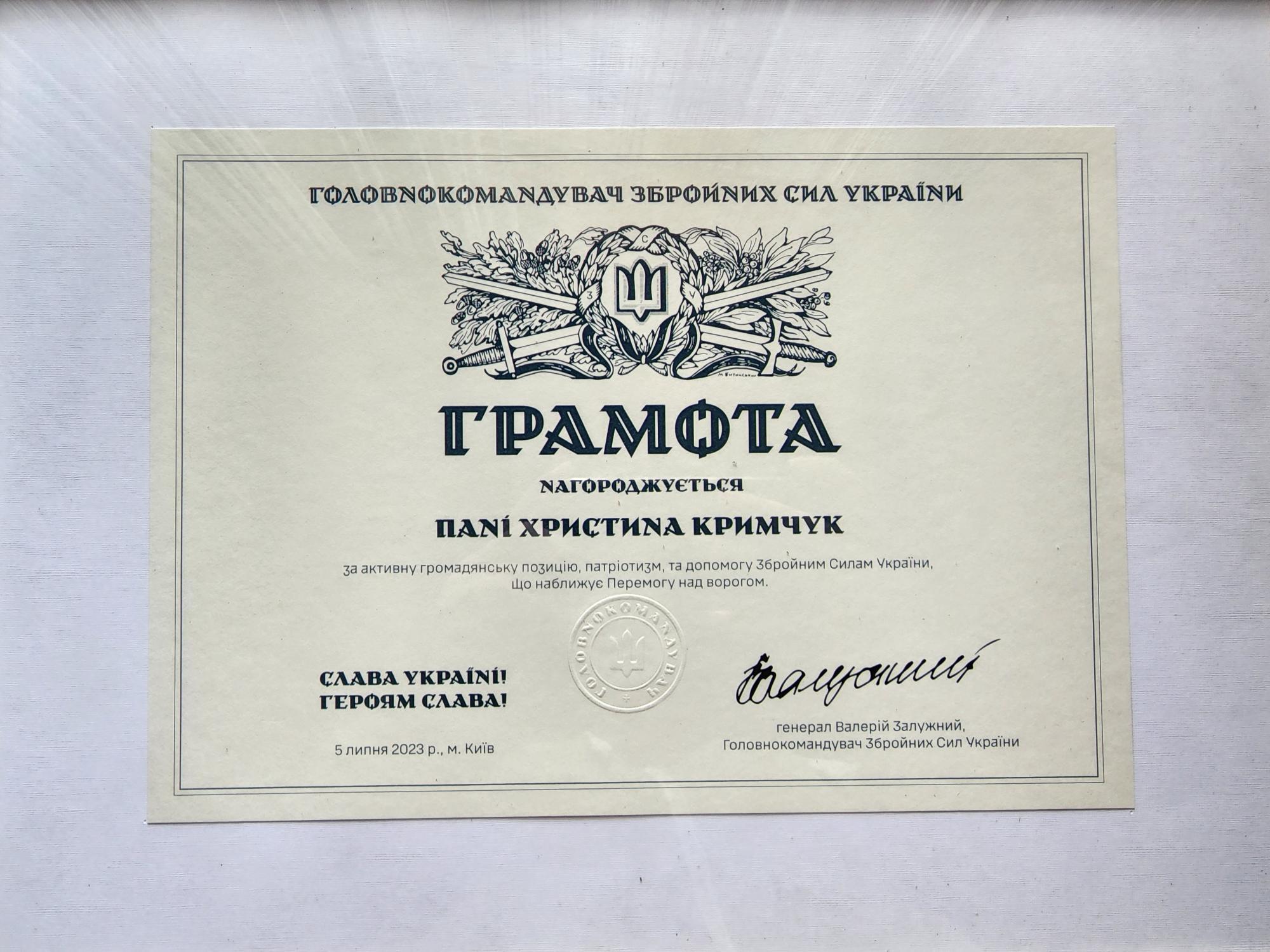 Також Христина наприкінці минулого року отримала грамоту від Головнокомандувача Валерія Залужного. Нею нагороджують за активну громадську та волонтерську діяльність.