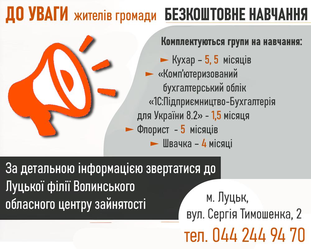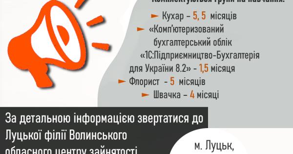 До уваги жителів громади: Луцька філія Волинського обласного центру зайнятості анонсує безкоштовне навчання для різних професій.
