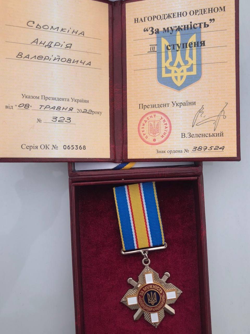 Військовослужбовця удостоєно високої державної нагороди згідно указу Президента України Володимира Зеленського від 08.05.2022 за особисту мужність і самовіддані дії, виявлені у захисті державного суверенітету та територіальної цілісності України, вірність військовій присязі.