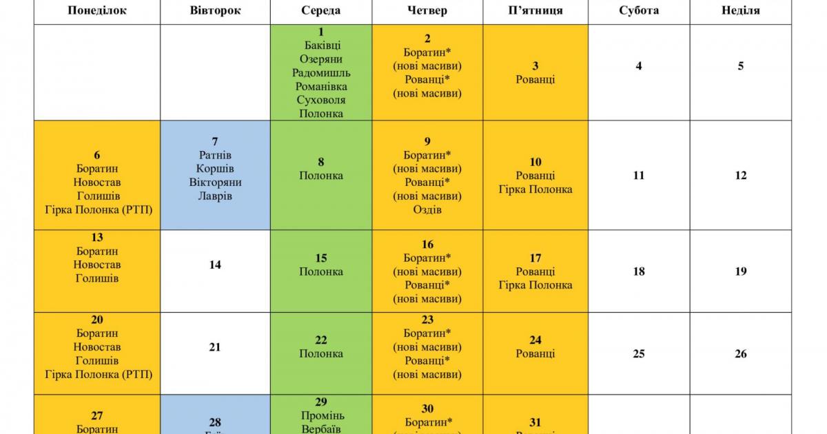 • перша середа місяця – Баківці, Озеряни, Радомишль, Романівка, Суховоля