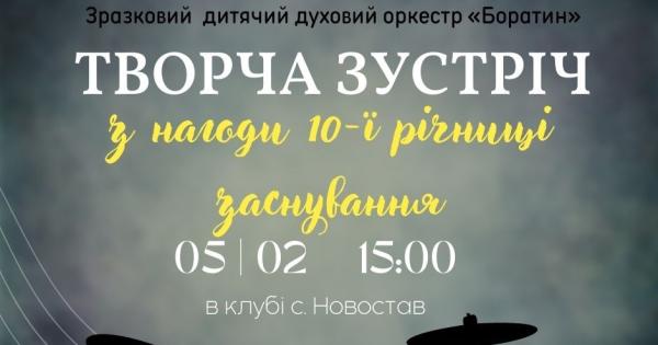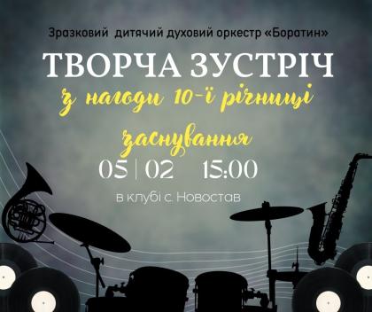 5 лютого о 15:00 в клубі села Новостав відбудеться творча зустріч, присвячена 10-й річниці з дня заснування зразкового дитячого духового оркестру «Боратин» Боратинської громади. Оркестр запрошує всіх колишніх учасників, їх батьків та просто поціновувачів музичного мистецтва!