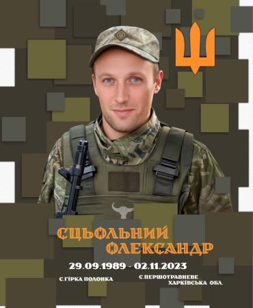 2 листопада 2023 року в результаті ворожого обстрілу під час виконання бойового завдання Сцьольний Олександр Вікторович загинув у населеному пункті Першотравневе, Куп’янського району, Харківської області.