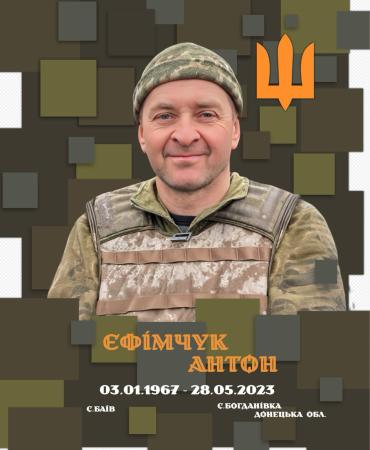 24 лютого 2022 року Єфімчук Антон, разом з 10 односельчанами, не роздумуючи, пішов добровольцем захищати свою країну. Біля року його служба проходила на Волині у 53 окремому батальйоні ТрО. У березні 2023 року був переведений під Бахмут. 28 травня 2023 року обірвалося життя Антона поблизу села Богданівка Бахмутського району в наслідок ворожого мінометного обстрілу.